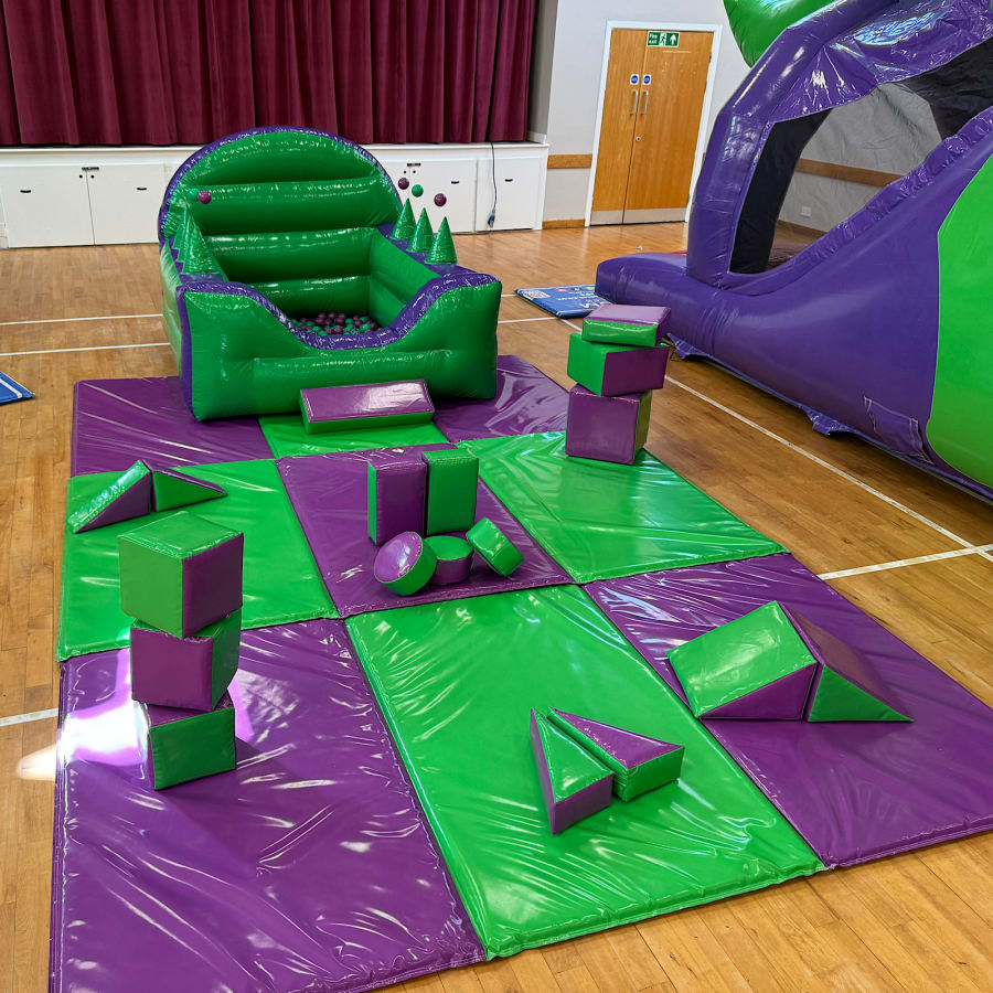- 18 matching purple & green soft play shapes (blocks, wedges, cylinders)