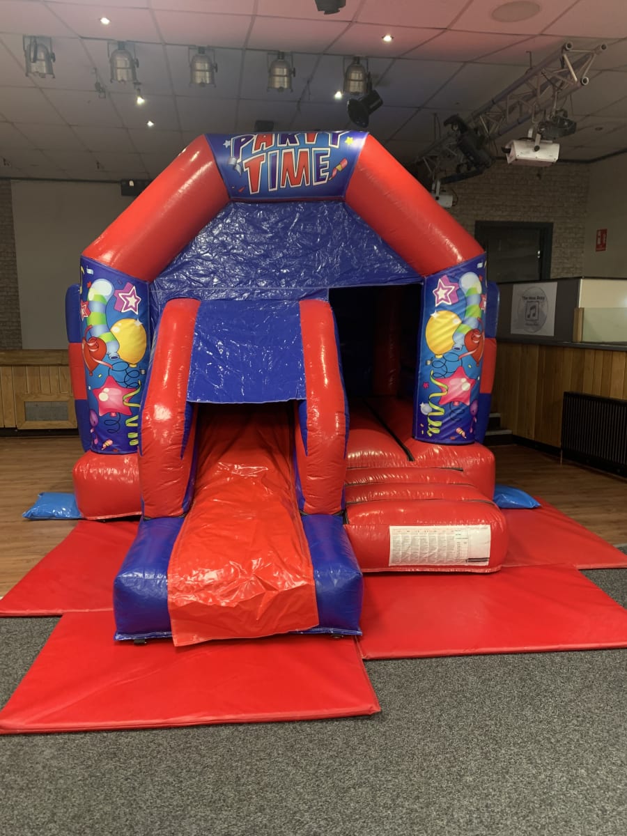 Our Red and Blue Party Time Themed Mega Pack includes, our highly demanded popular Bounce N' Slide Bounce Castle with front Slide Combo. it's the perfect choice for all your indoor venue hires, being only 9.5ft in height.