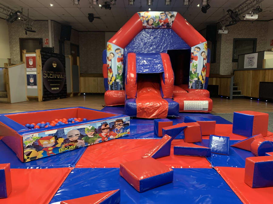 The package includes a foam ball pool our 17pc matching Superheroes soft play and red/blue matching Mega mat set up ! This Package is the perfect choice for Indoor hires.