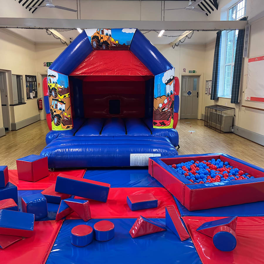 Premium Inflatables brings you one of our new purchases and additions to our outstanding premium 2024 fleet!! The Diggers Themed Mega Soft Play Package is where your little boys can run, bounce and play at being mini Diggers as we all know boys love their big toys ! The Diggers Themed bouncy castle 12x15ft is Ideal for all your indoor and outdoor events and special occasions. This castle is paired with a foam ball pool, 17 pieces of soft play and 9 matching mat set up to make an incredible package.
