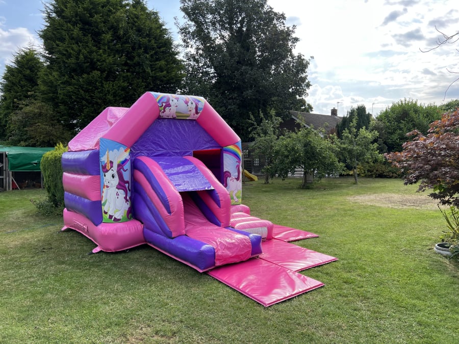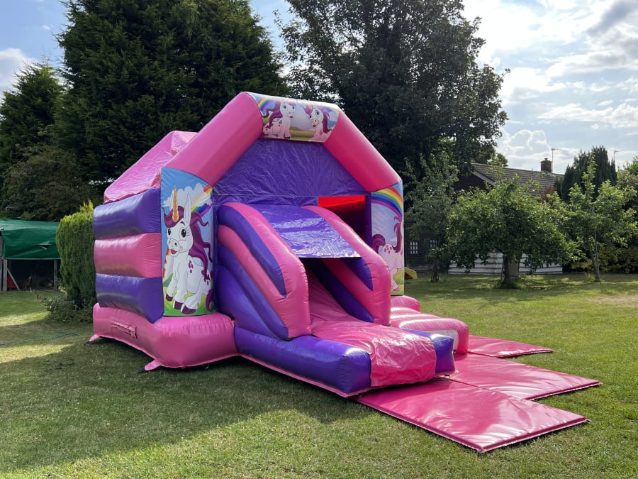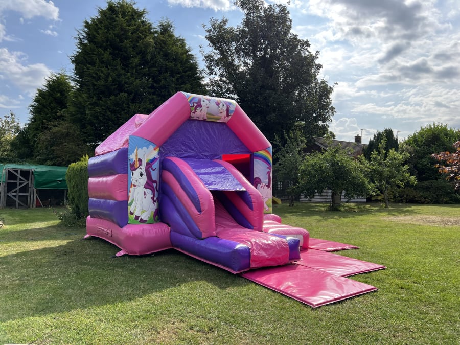 The Unicorn Themed bouncy castle with a slide is a amazing addition to any birthday party or event, boasting the classic cartoon Unicorn artwork which is finished in a modern gloss to match the premium gloss finish on all our inflatables.