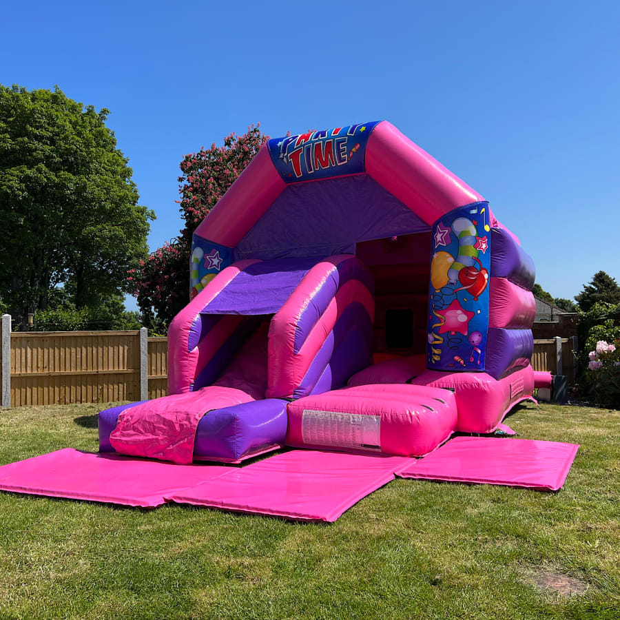 The Party Time Themed bouncy castle with slide is Ideal for all your indoor and outdoor events and special occasions. This castle can be easily paired with ball pools, soft play, matching mat set up and even bigger super slides to make an incredible package catering for a variety of age groups.