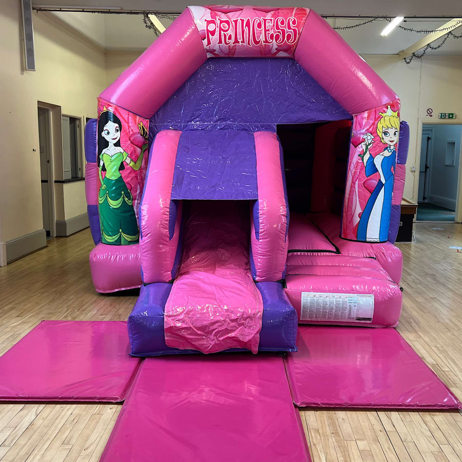 The Princess Themed bouncy castle with slide is Ideal for all your indoor and outdoor events and special occasions. This castle can be easily paired with ball pools, soft play, matching mat set up and even bigger super slides to make an incredible package catering for a variety of age groups.