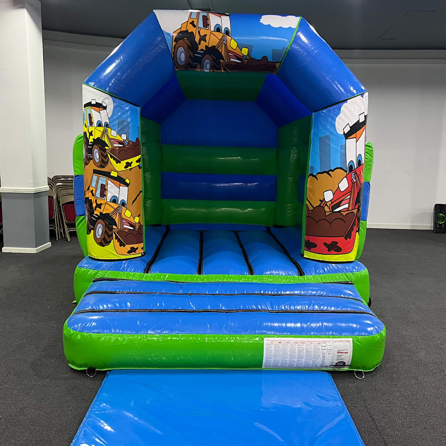 The Diggers Themed bouncy castle is Ideal for all your indoor and outdoor events and special occasions. This castle can be easily paired with matching toddlers slides, ball pools, soft play and matching mat set up to make an incredible premium deluxe package.