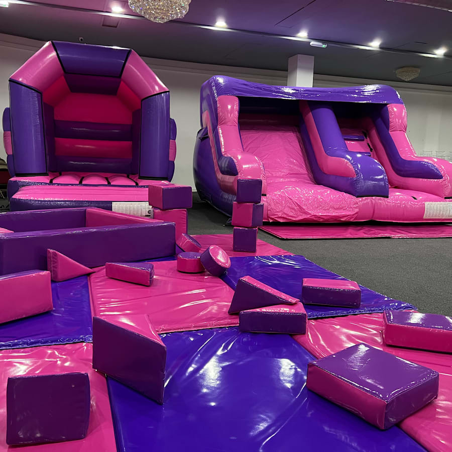 The Plain No Theme Pink / Purple Super size package which includes our amazing Bouncy Castle, Mini Slide, Soft Play + Mega Mat set up and Matching Foam Ball Pool is the ultimate addition to any under 5's, Toddlers Birthday party or event, boasting our amazing pink and purple girly colours which are finished in a modern gloss to match the premium gloss finish on all our accessories and inflatables.