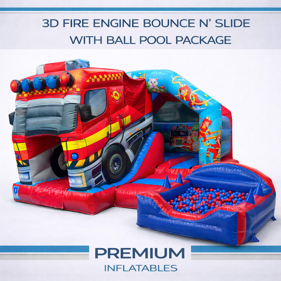 Premium Inflatables bring action-packed fun to children’s parties with our 3D Fire Engine Bounce n’ Slide With Ball Pool Package – a fantastic themed setup combining energetic bouncing and sliding with a safe, toddler-friendly ball pool play zone. This package is ideal for mixed-age parties, indoor venues and fire engine–themed celebrations.