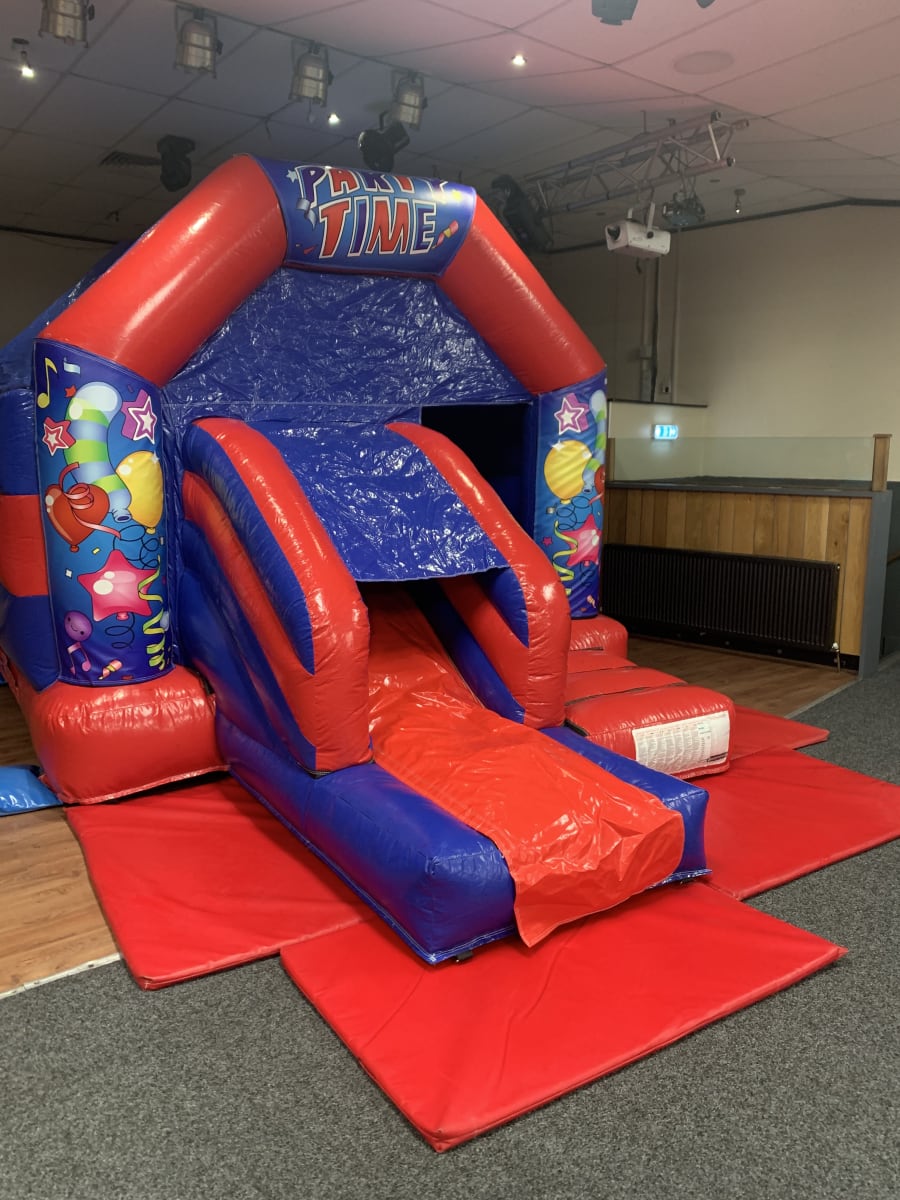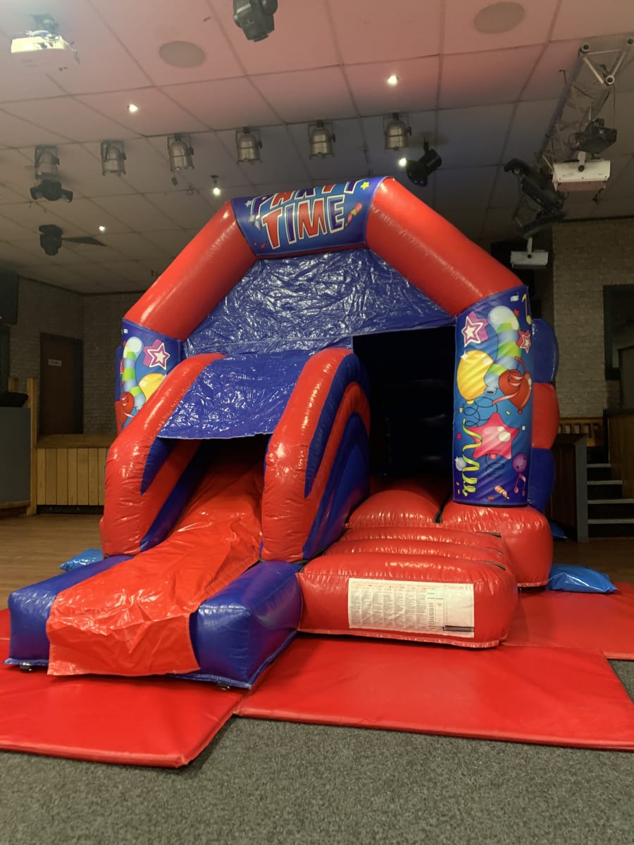 Our Red and Blue Party Time Themed Mega Pack includes, our highly demanded popular Bounce N' Slide Bounce Castle with front Slide Combo. it's the perfect choice for all your indoor venue hires, being only 9.5ft in height.