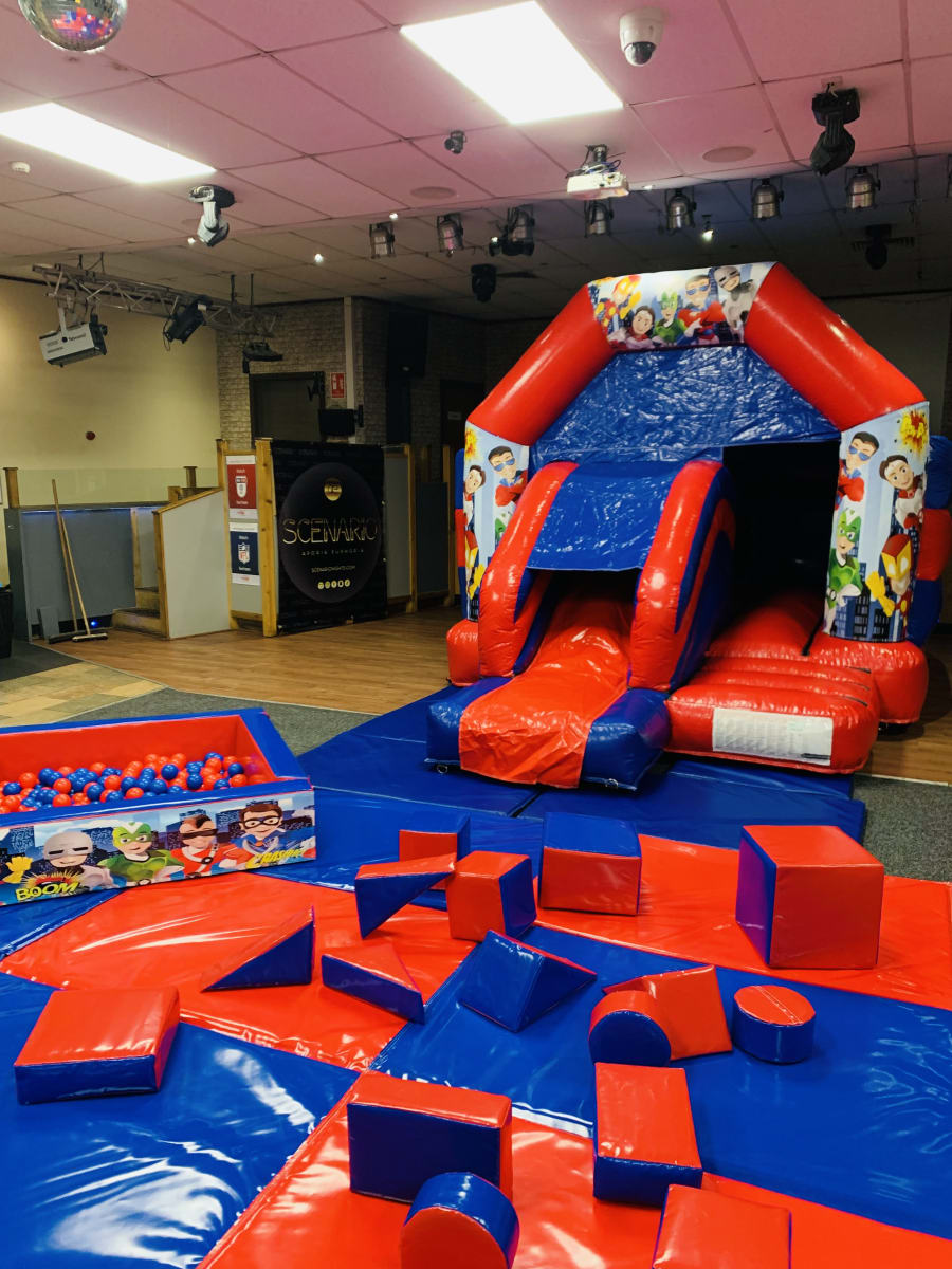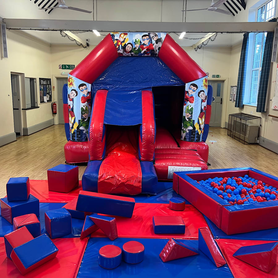 The package includes a foam ball pool our 17pc matching Superheroes soft play and red/blue matching Mega mat set up ! This Package is the perfect choice for Indoor hires.